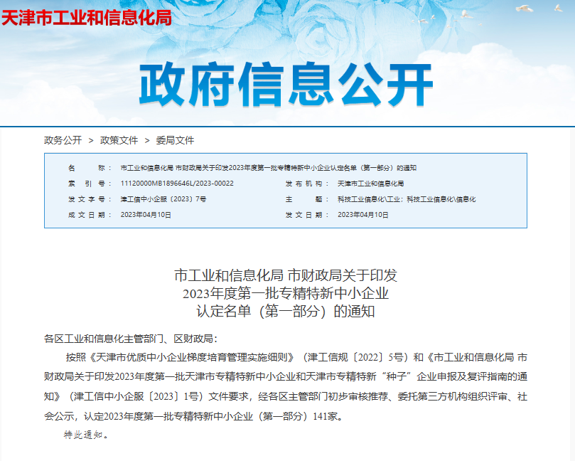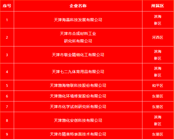 近日,市工業和信息化局、市財政局發布了《市工業和信息化局對2023年度第一批天津市專精特新中小企業擬認定名單的公示》,渤化集團所屬企業天津海晶科技發展有限公司、天津市合成材料工業研究所有限公司、天津市敬業精細化工有限公司、天津七二九體育用品有限公司、天津渤海物聯科技股份有限公司、天津渤化環境修復股份有限公司、天津市化學試劑研究所有限公司、天津渤化安創科技有限公司、天津市精美特表面技術有限公司共9家被認定為2023年度第一批天津市專精特新中小企業。
