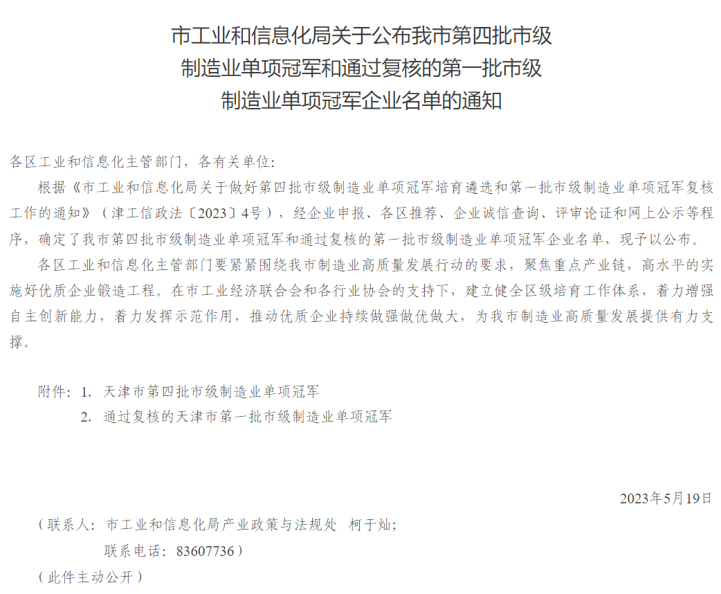 近日,市工業(yè)和信息化局發(fā)布《市工業(yè)和信息化局關(guān)于公布我市第四批市級制造業(yè)單項冠軍和通過復(fù)核的第一批市級制造業(yè)單項冠軍企業(yè)名單的通知》,渤化集團(tuán)所屬天津大沽化工股份有限公司、天津市橡膠工業(yè)研究所有限公司2家企業(yè)被認(rèn)定為天津市制造業(yè)單項冠軍企業(yè)。截至目前,渤化集團(tuán)擁有天津市級制造業(yè)單項冠軍4家,另外2家分別是天津萬華股份有限公司、天津長蘆漢沽鹽場有限責(zé)任公司。