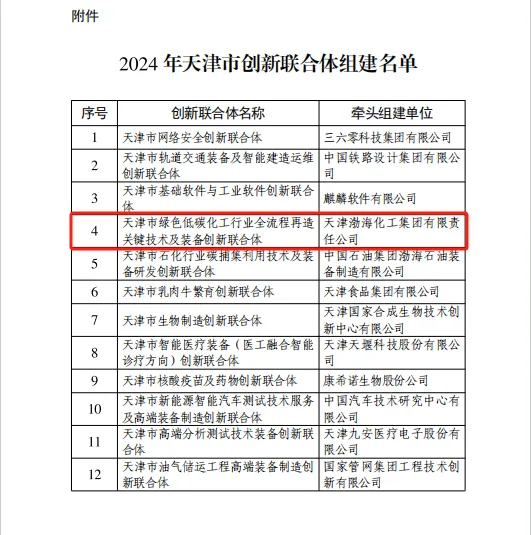 12月19日,天津市科技局發布《市科技局關于2024年組建天津市創新聯合體的通知》,經專家評審、會議審議和公示等程序,天津渤海化工集團有限責任公司(以下簡稱“渤化集團”)牽頭組建的天津市綠色低碳化工行業全流程再造關鍵技術及裝備創新聯合體正式獲批組建。