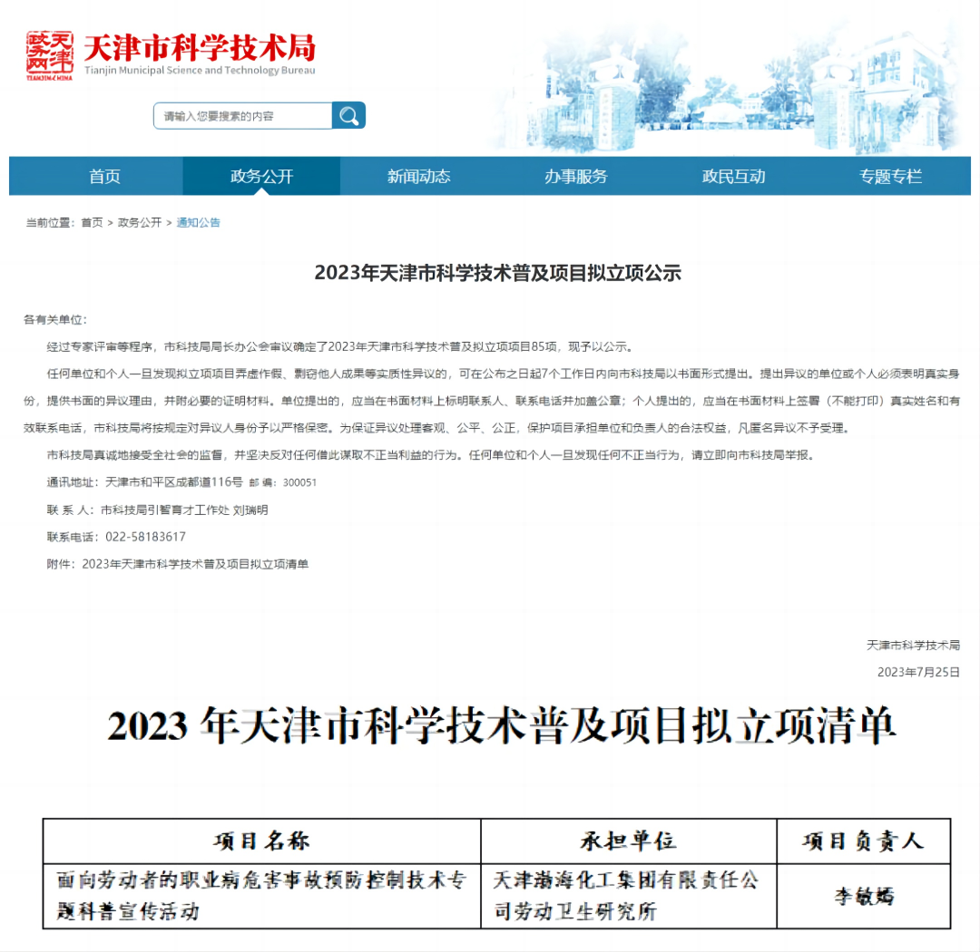 近日,2023年天津市科學技術普及項目擬立項清單公示,天津渤海化工集團有限責任公司勞動衛生研究所申報的“面向勞動者的職業病危害事故預防控制技術專題科普宣傳活動”項目榮登榜單。