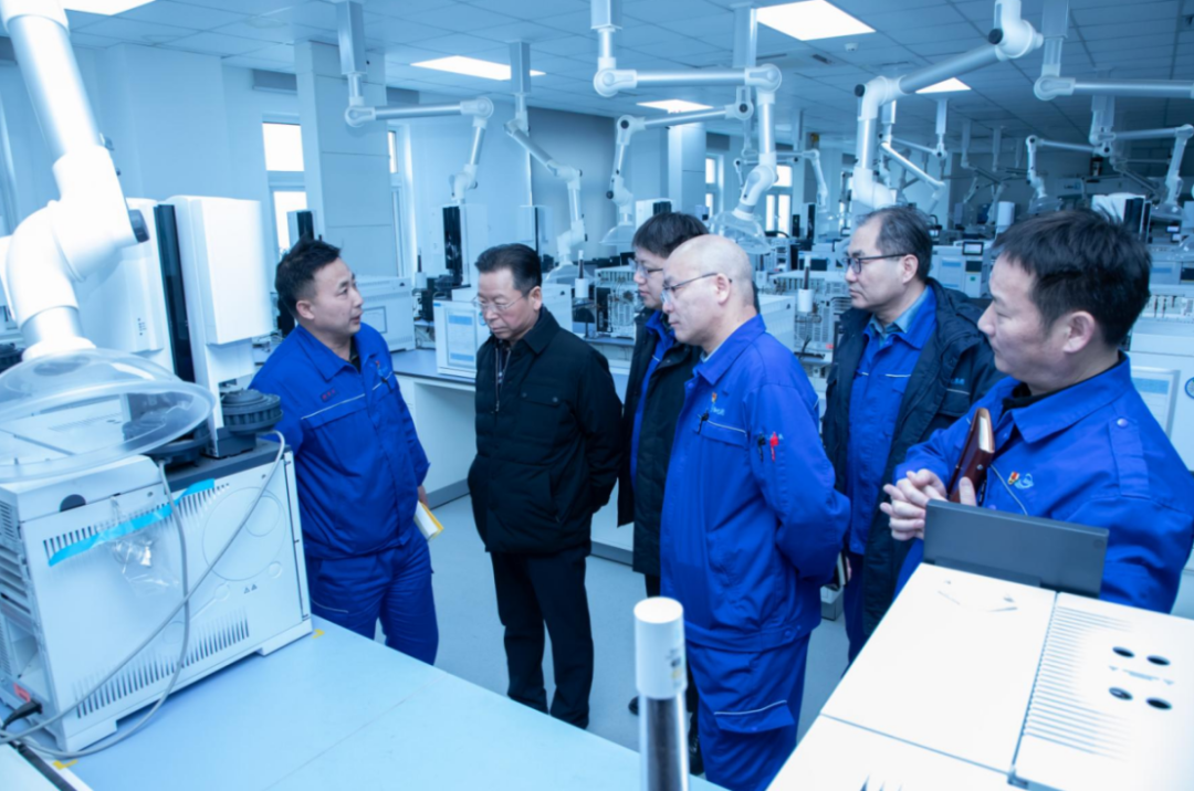 在精細公司,王俊明一行先后前往敬業實驗室、燕海實驗室、精細化工新技術研究所中心實驗室及合材所A車間中試平臺進行實地調研,并進行座談交流。精細公司黨委書記、董事長劉培清,黨委副書記、總經理宋敬忠等陪同。