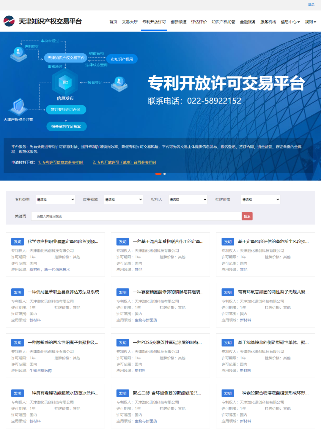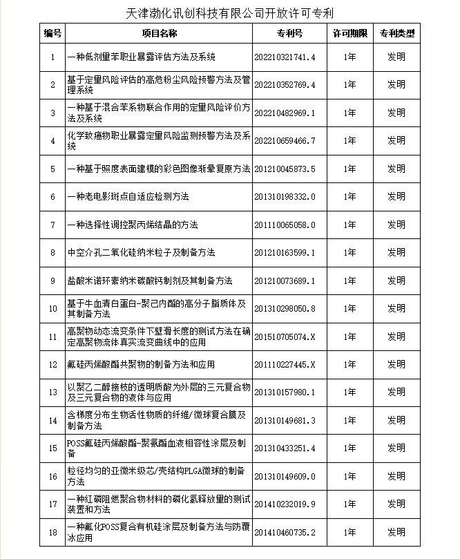天津渤化訊創科技有限公司作為渤化集團知識產權運營中心的建設主體,同時也是天津市知識產權運營中心、濱海新區優勢產業知識產權運營中心,積極貫徹落實國家知識產權局對專利開放許可試點工作的部署和天津市專利開放許可試點工作的要求。本次開放許可的35件高價值發明專利,涵蓋職業健康、新材料、新一代信息技術等技術領域,具備一定的市場前景、應用廣泛、實用性較強,按照一次總付的方式,許可期限一年。