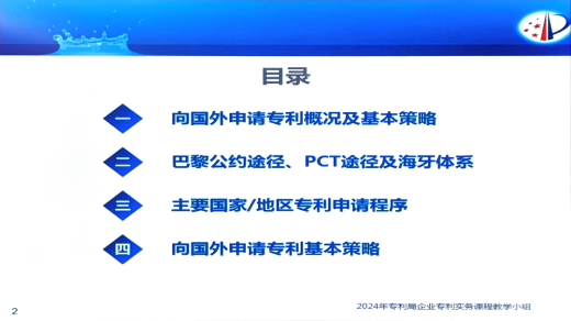 主講專家來自國家知識產(chǎn)權(quán)局專利局初審及流程管理部,培訓重點內(nèi)容涉及向國外申請專利途徑(巴黎公約、PCT、 海牙協(xié)定)流程,及去主要國家(美國、歐洲、日本)的申請程序,尤其是向國外申請專利的程序加快策略、費用節(jié)省策略等。