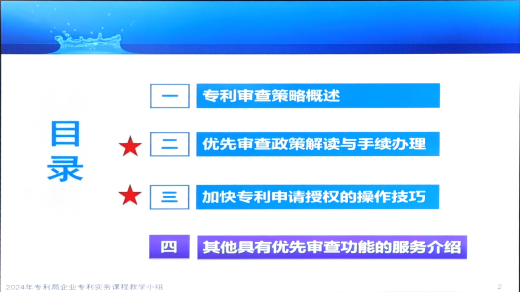 主講專家來自國家知識產(chǎn)權(quán)局專利局初審及流程管理部,培訓重點內(nèi)容涉及優(yōu)先審查、延遲審查、集中審查等政策,特別是詳細介紹優(yōu)先審查程序,關(guān)于加快專利申請授權(quán)的操作技巧,對交底書的撰寫、答復審查意見等策略。