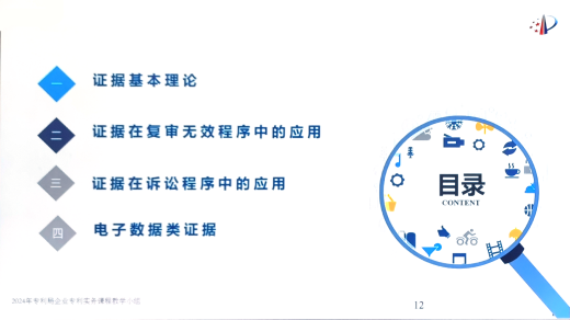 主講專家來自國家知識產(chǎn)權(quán)局專利局復審和無效審理部,培訓重點內(nèi)容涉及各類證據(jù)在復審無效程序中的應用、證據(jù)在訴訟程序中的應用,以及最近比較熱門的電子證據(jù)相關(guān)知識等。