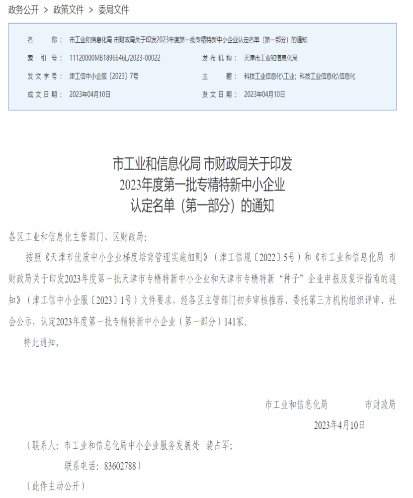 近日,市工業和信息化局、市財政局發布《市工業和信息化局 市財政局關于印發2023年度第一批專精特新中小企業認定名單(第一部分)的通知》,集團公司所屬海晶科技、合材所2家單位被認定為2023年度第一批天津市專精特新中小企業。