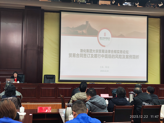 按照集團專項提升年工作安排,為進一步加強學習型組織建設,大力推行“業(yè)財一體、法商融合”的管理理念以及“風控合規(guī)、行穩(wěn)致遠”的合規(guī)文化,促進全集團管理提升,為渤化集團數字化轉型和高質量發(fā)展打下堅實基礎,2023年12月22日,集團公司協(xié)同渤化進出口公司共同組織各二級子企業(yè)和主要貿易公司召開管理提升系列講座之貿易實務風險防范第一期沙龍講座。