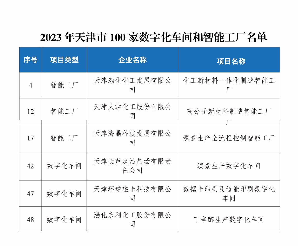 2024年1月23日,市工業和信息化局公布2023年100家天津市數字化車間和智能工廠名單,渤化集團下屬渤化發展、大沽化工、海晶科技、漢沽鹽場、磁卡科技、渤化永利六家企業榮獲“天津市數字化車間和智能工廠”稱號。